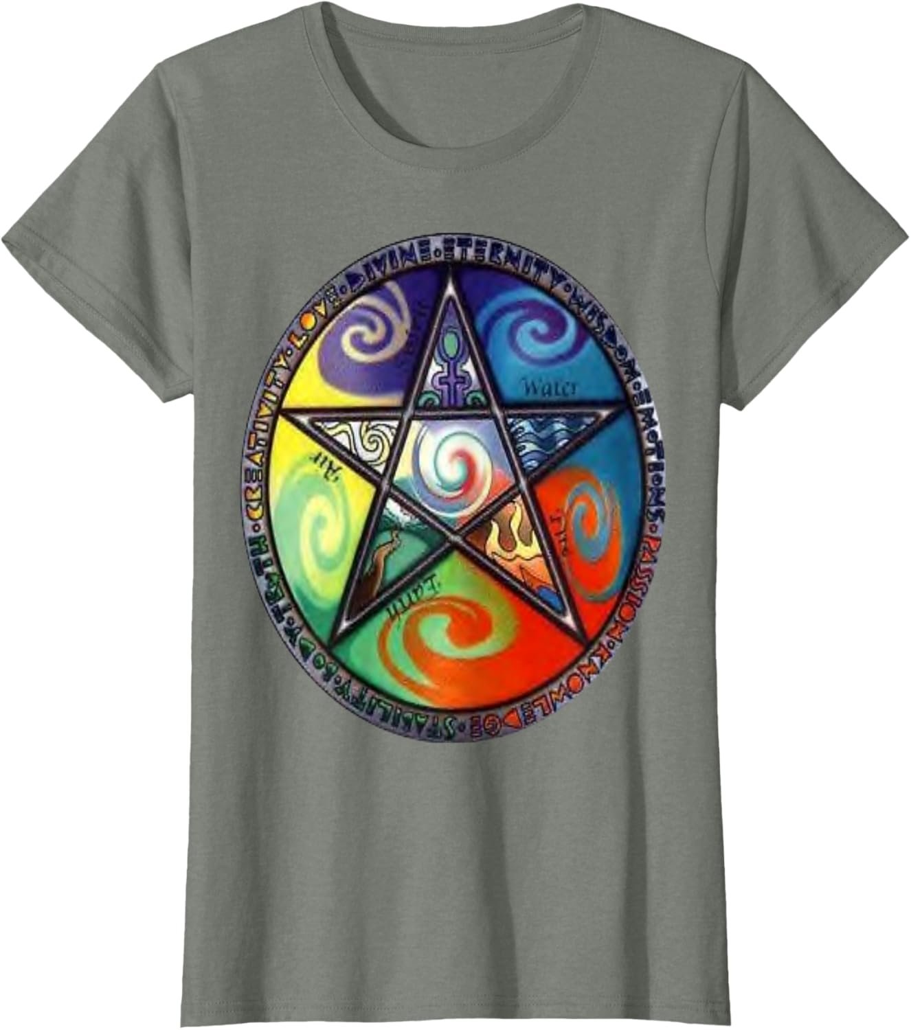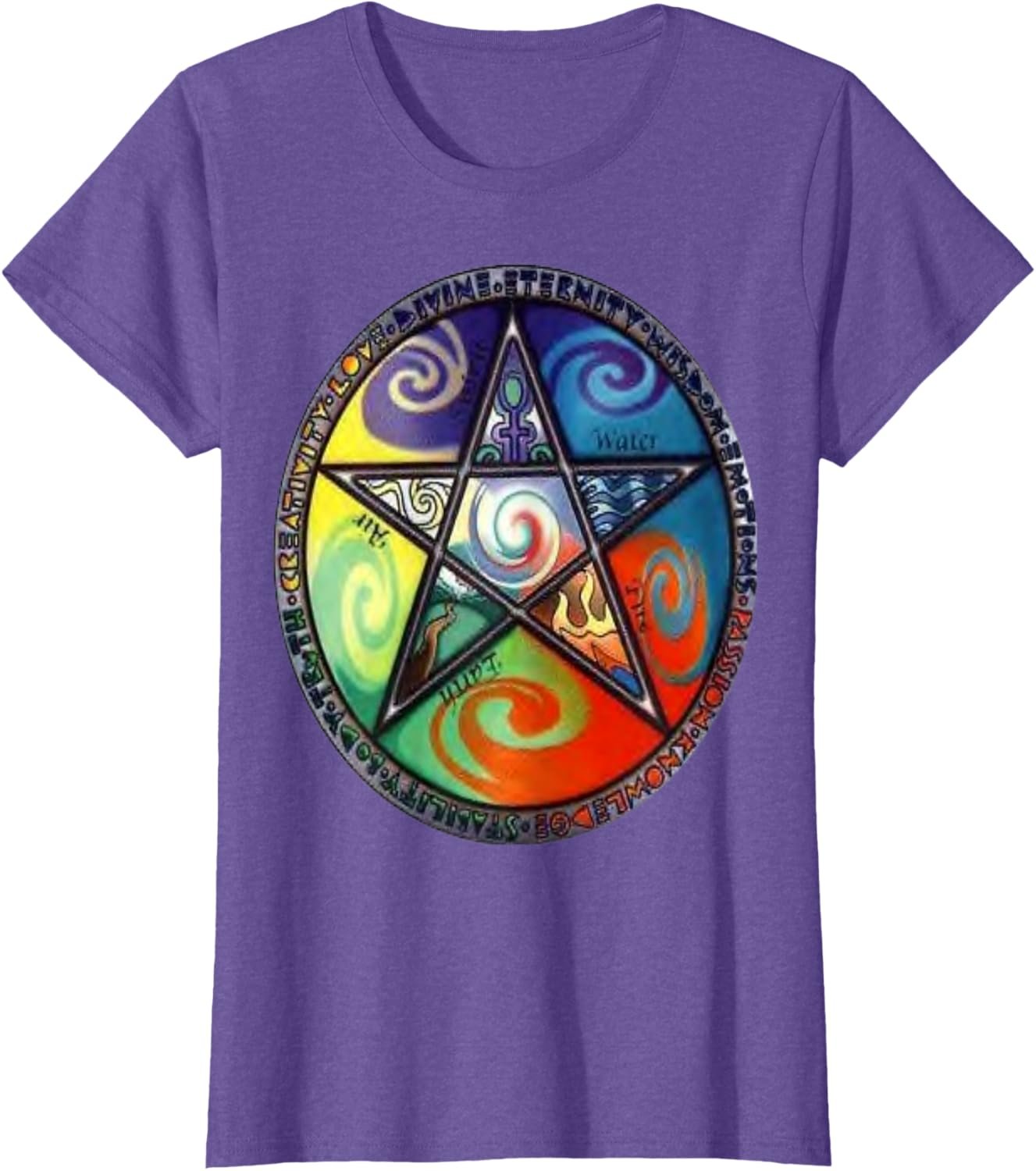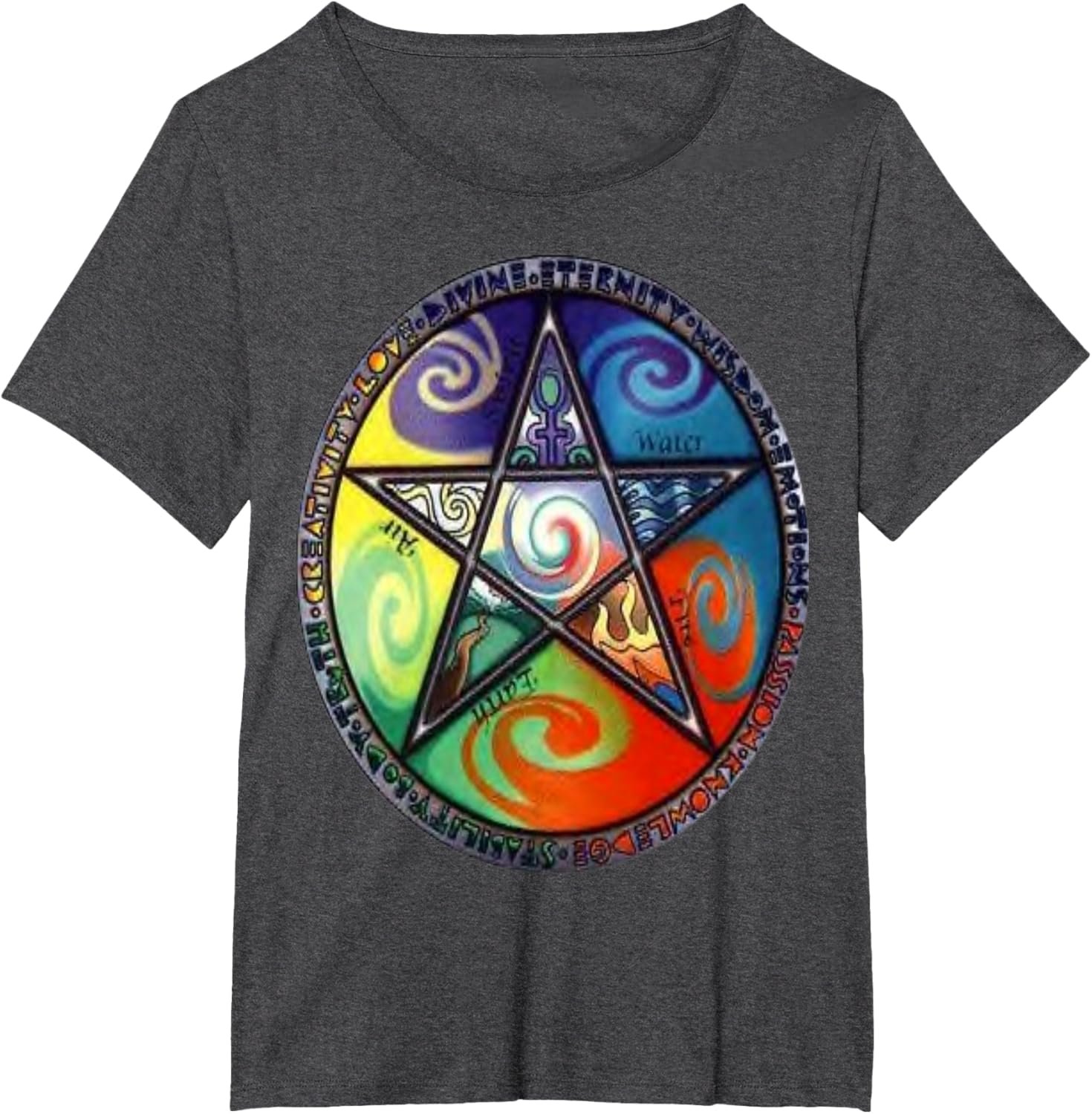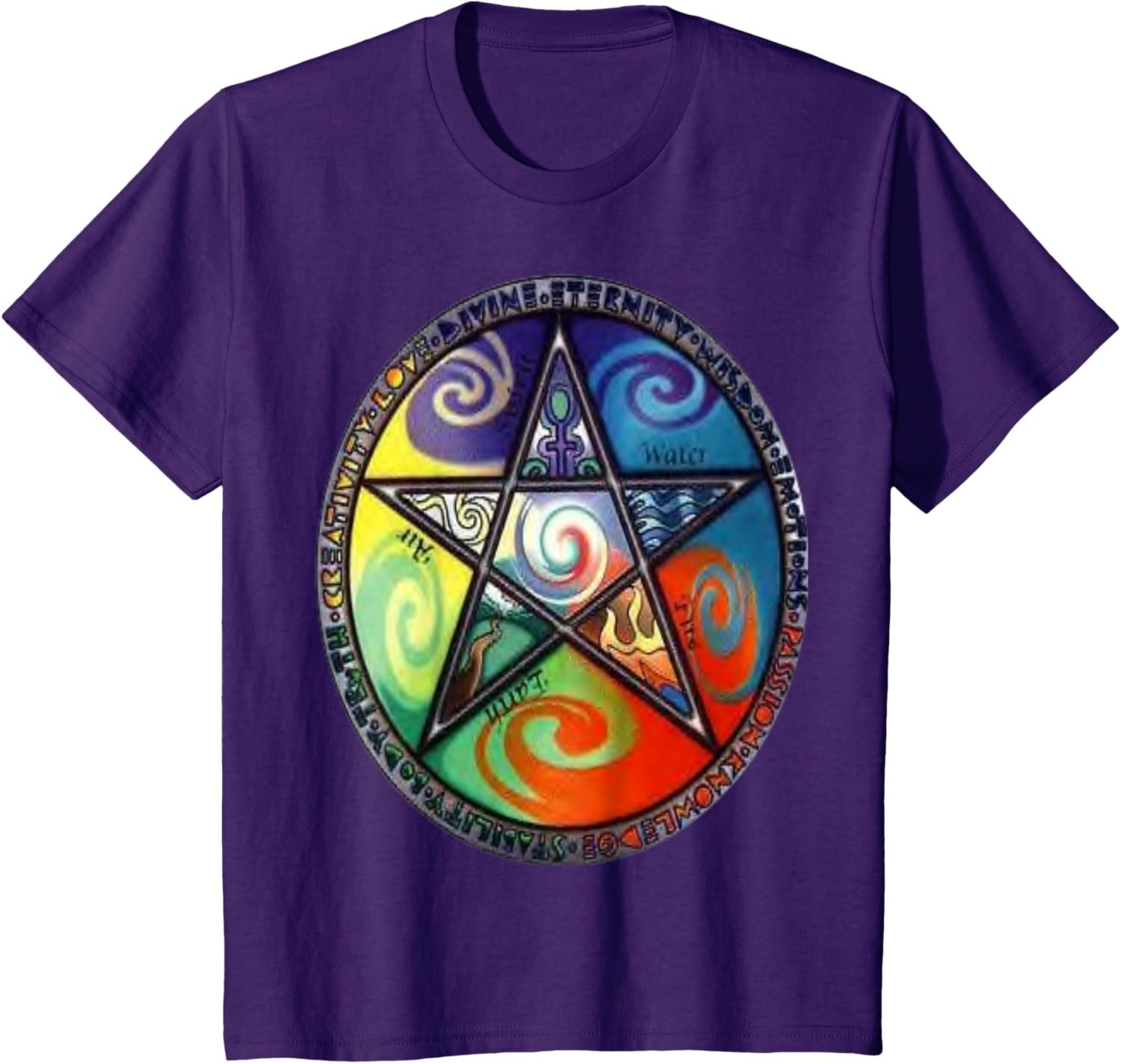- Wiccan Pagan Spirituality design. A five pointed star in circle with pagan symbols for Earth, Air, Fire, Water and Spirit.