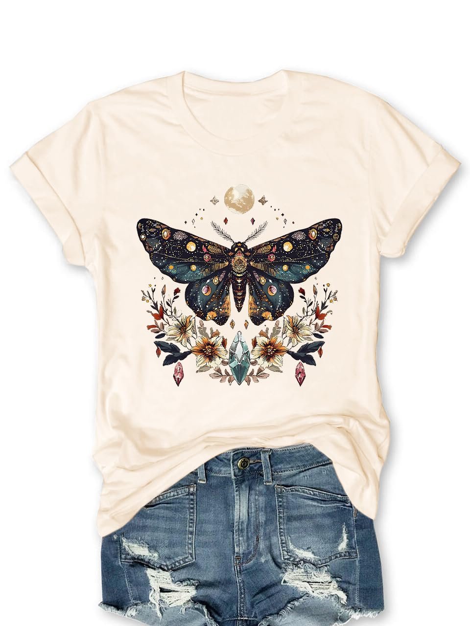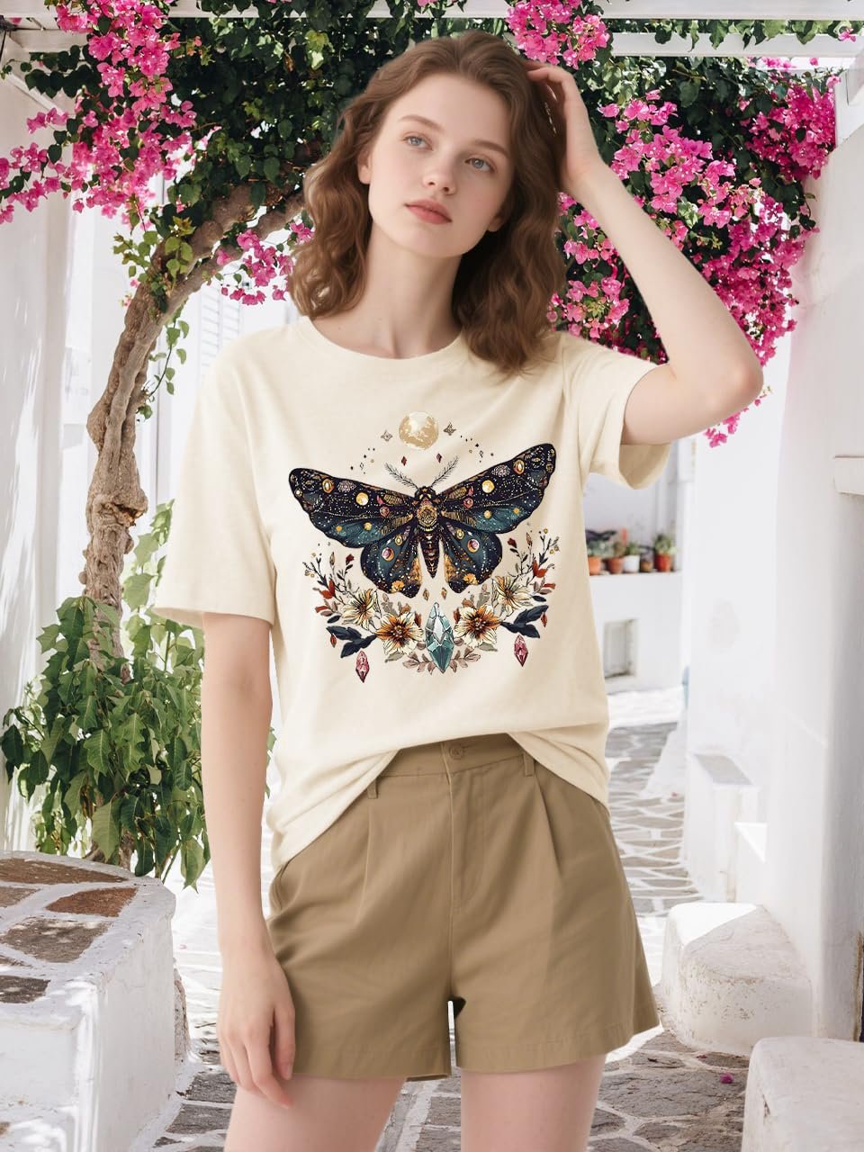 Women Vintage Moth T Shirts Mystical Moon Cottagecore Shirts Funny Witchy Graphic Tees Short Sleeve Tops