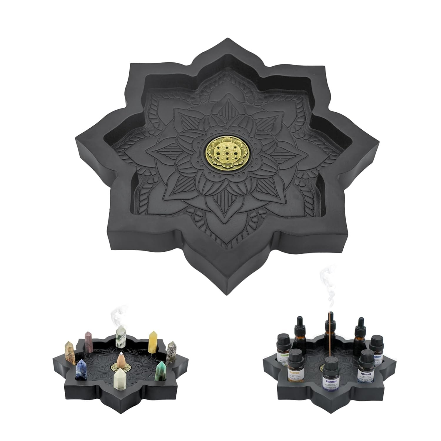 - Functional Organization: Keep small items tidy—ideal for holding rings, earrings, bracelets, or diffuser bottles. The carved grooves securely hold incense sticks, and the center reservoir catches ash or holds cone incense.