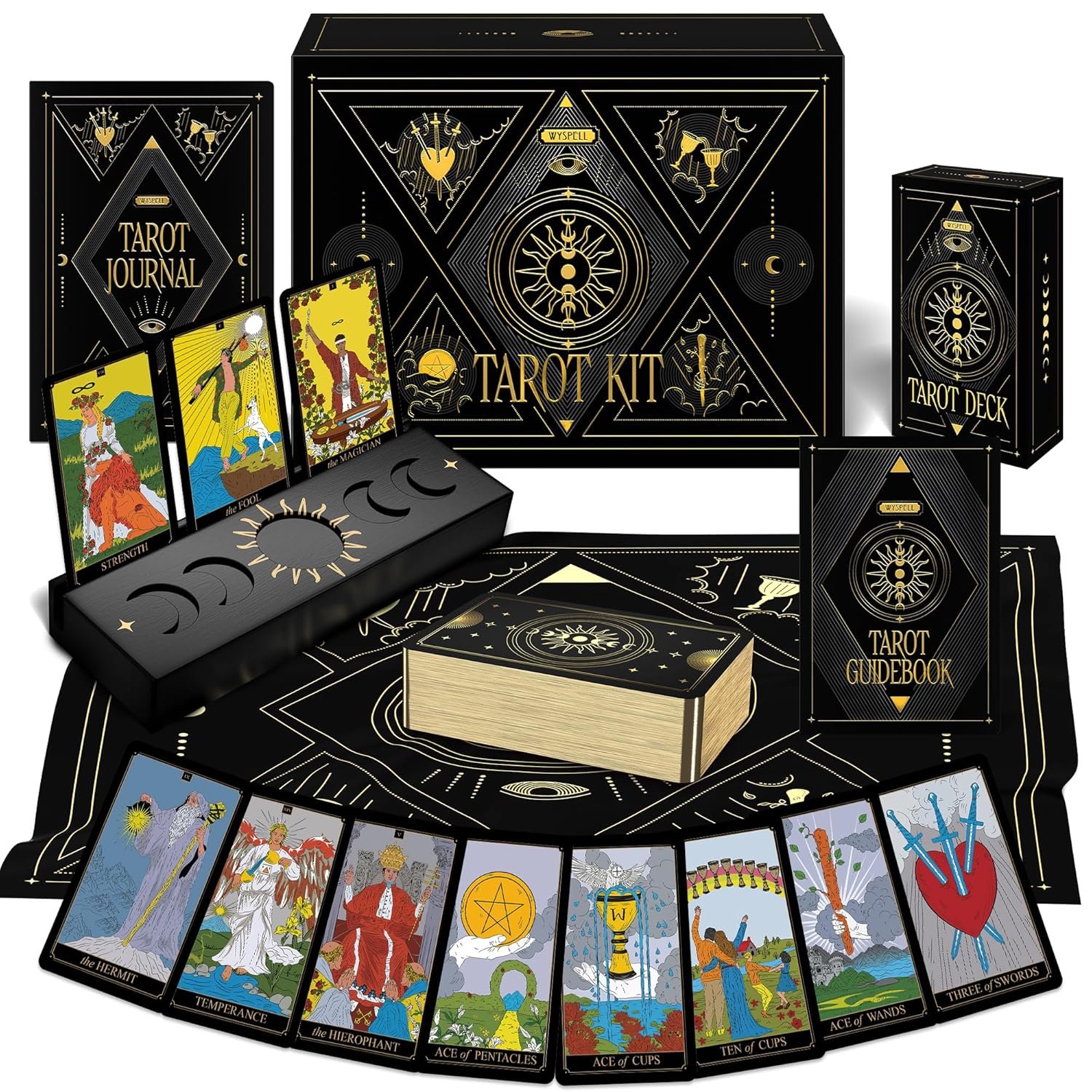 Wyspell Tarot Kit Includes Gold Tarot Cards with Guide Book, a Cloth, a Bag, a Journal, and a Classic Deck Holder – Beautiful Taro Cards for Beginners Kit